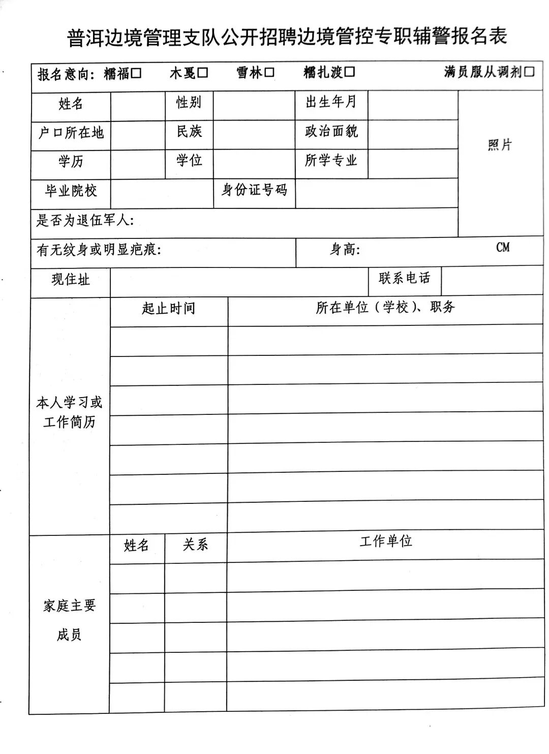 1.普洱边境管理支队公开招聘边境管控专职辅警报名表